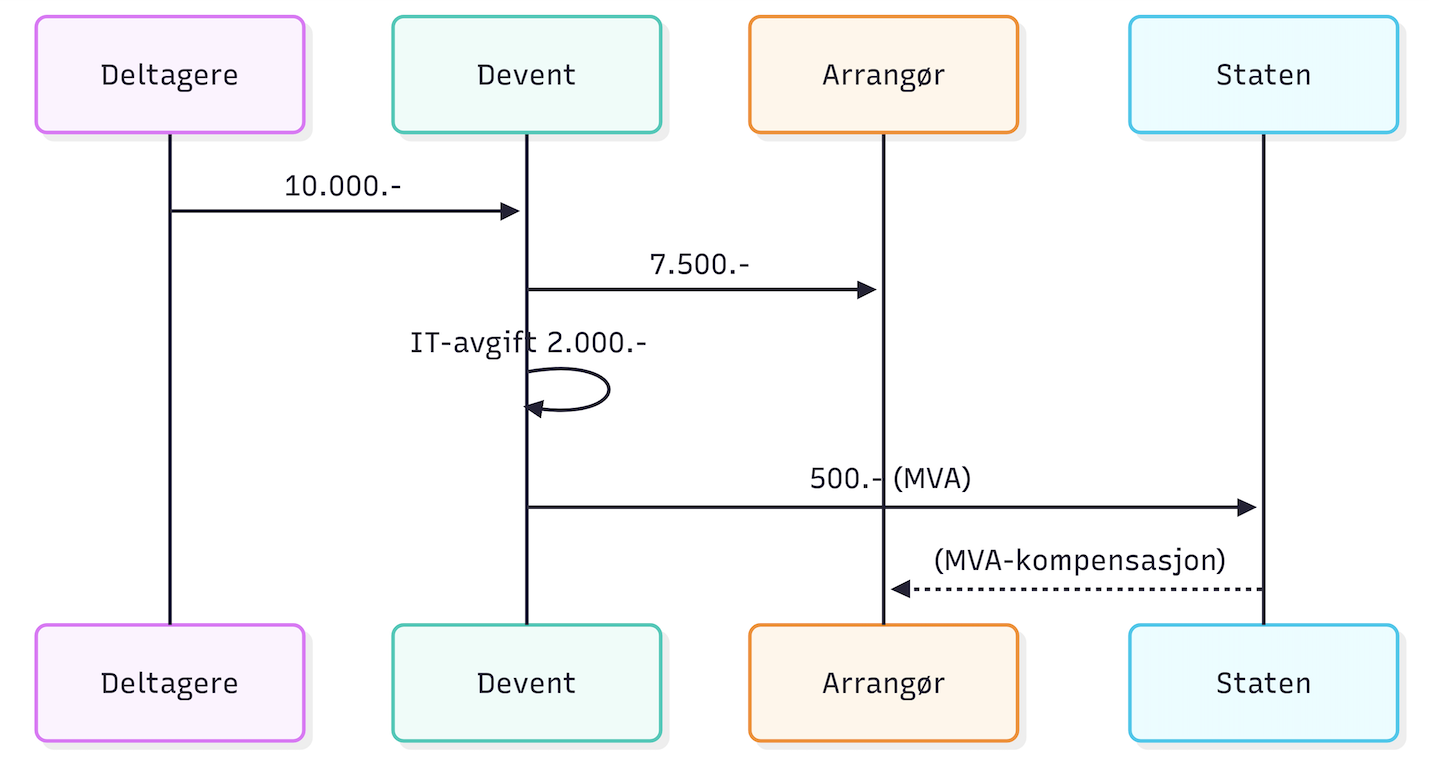 Fra og med 1. januar 2025 vil det legges til merverdiavgift (mva) på kostnader relatert til bruk av Devent. Dette er i henhold til gjeldende regelverk for tjenester som leveres i Norge. Merverdiavgiften innkreves av Devent på vegne av staten, og disse midlene tilfaller ikke Devent som selskap.