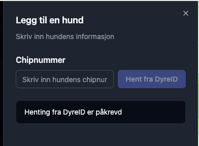 NB! Dersom du får feilmeldingen «Dette er ikke en hund, prøv med et annet chipnummer», betyr det at dyret ikke er registrert med art «Hund» hos DyreID. Kontakt DyreID for å få rettet dette.