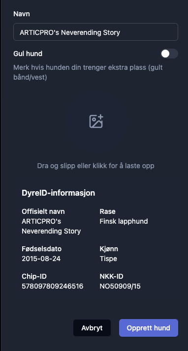 Verifiser at du har hentet rett hund og trykk "Opprett hund"