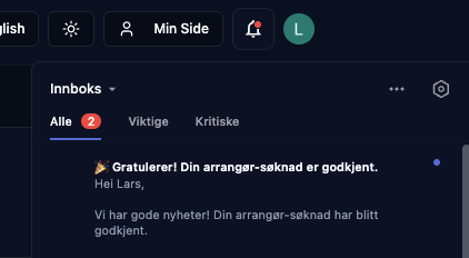 Når arrangøren er godkjent (eller avslått) kan du se dette fra varslinger, du vil også motta en egen epost om dette.