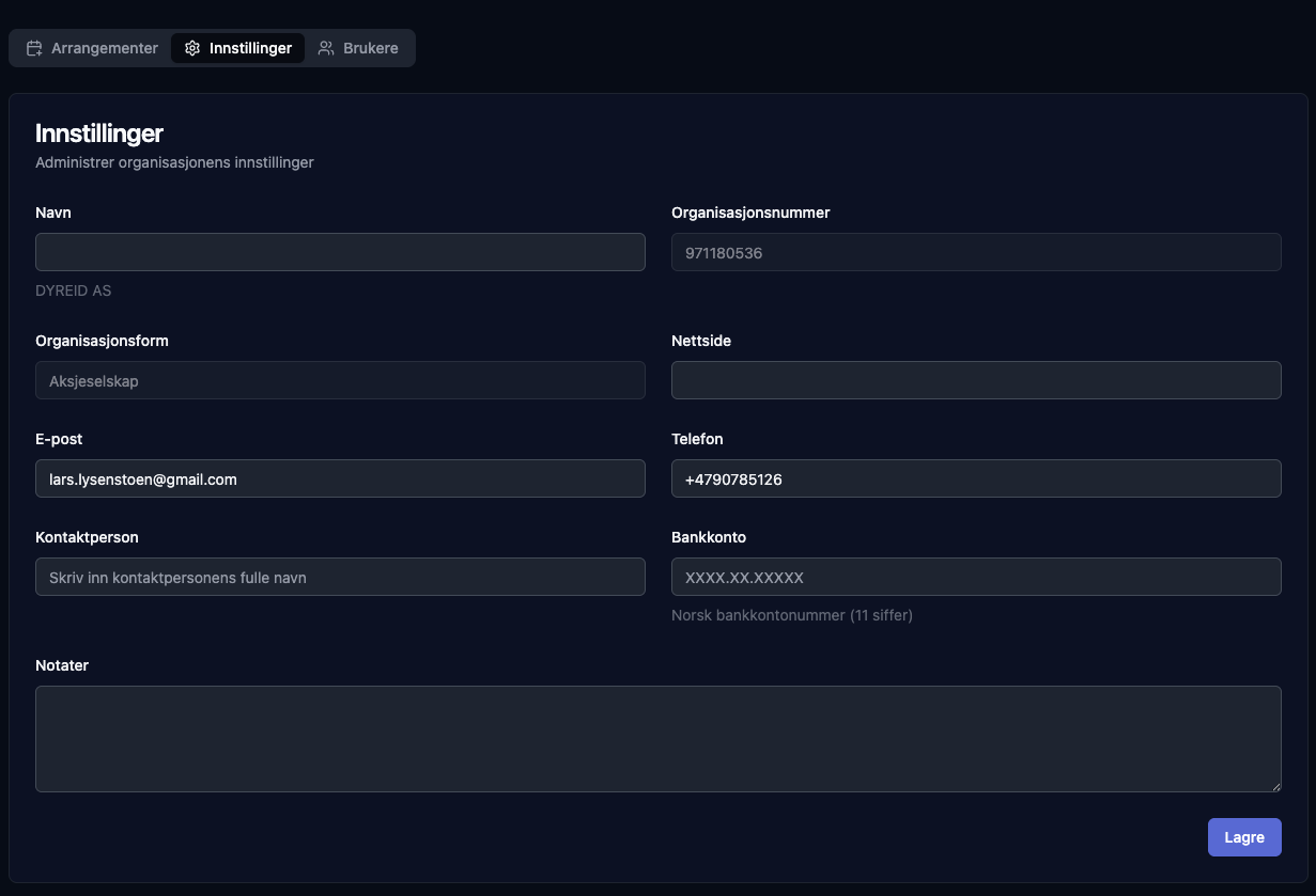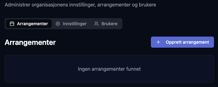 Når Instillinger er ferdig utfylt kan arrangement opprettes