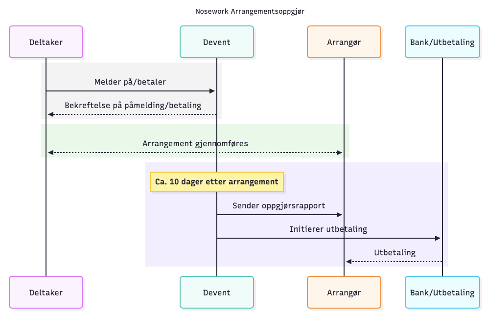 Deltakere melder seg på og betaler fortløpende. Etter at arrangementet er gjennomført sender Devent to dokumenter til arrangørens e-postadresse: